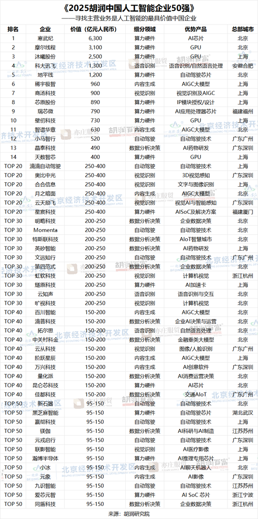 榜单聚焦于主营业务为AI算力或算法的中国企业。AI芯片企业寒武纪以6300亿元的价值位居榜首,比去年增长165%;国产GPU第一股摩尔线程排名第二,价值3100亿元;中国首批实现全流程国产化的高端GPU企业沐曦排名第三,价值2500亿元;语音识别龙头科大讯飞、机器视觉龙头商汤、多模态生成式AI先锋稀宇极智位居前十。
