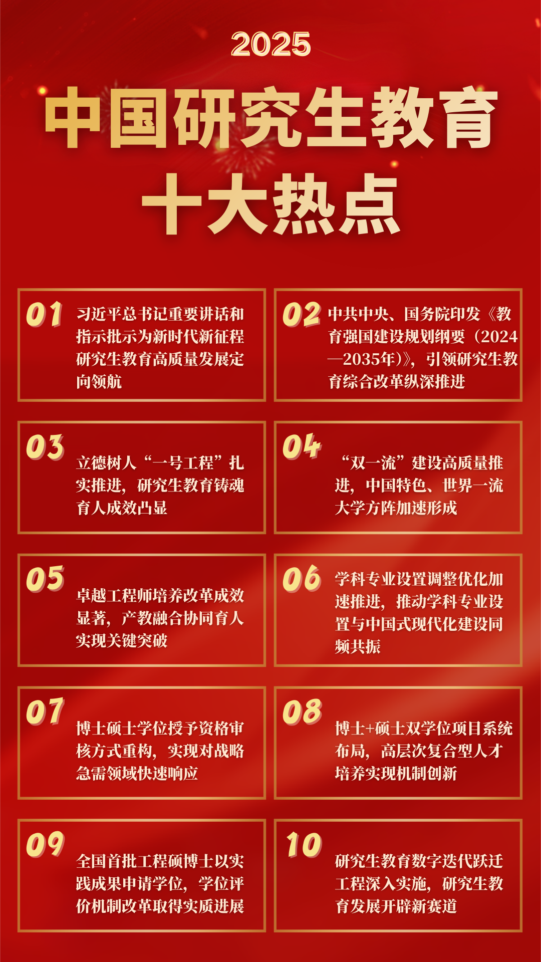2025年,是中国研究生教育改革纵深推进的关键一年。在教育部学位管理与研究生教育司指导下,教育部学位与研究生教育发展中心《中国研究生》杂志系统梳理全年研究生教育领域的大事要事和热点动态,发布2025年中国研究生教育十大热点。