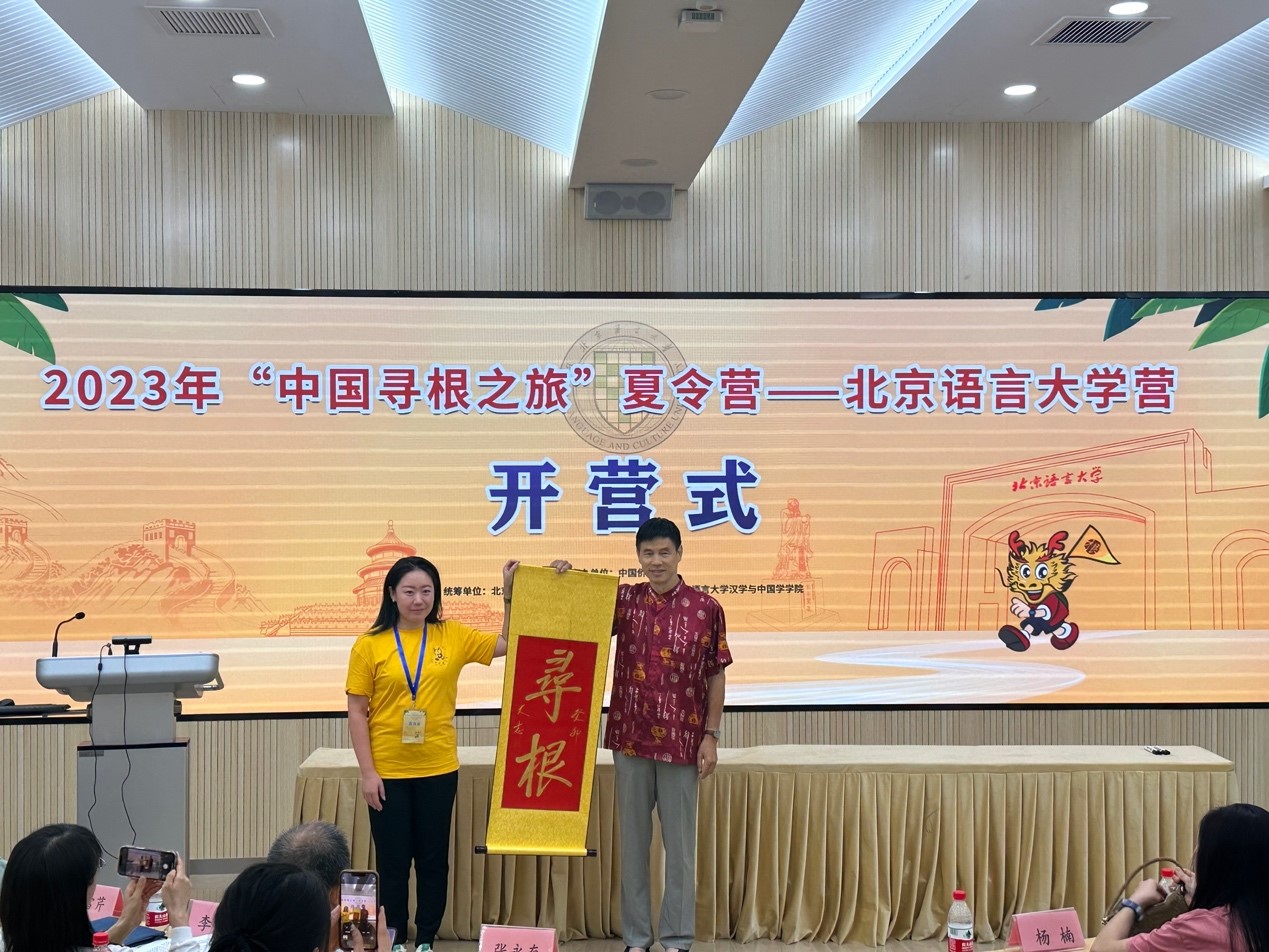 北京市侨联文化交流部副部长张永存向夏令营授旗,宣布开营。北京语言大学侨联小组副组长陈大志给夏令营赠送了书法作品——《寻根》。