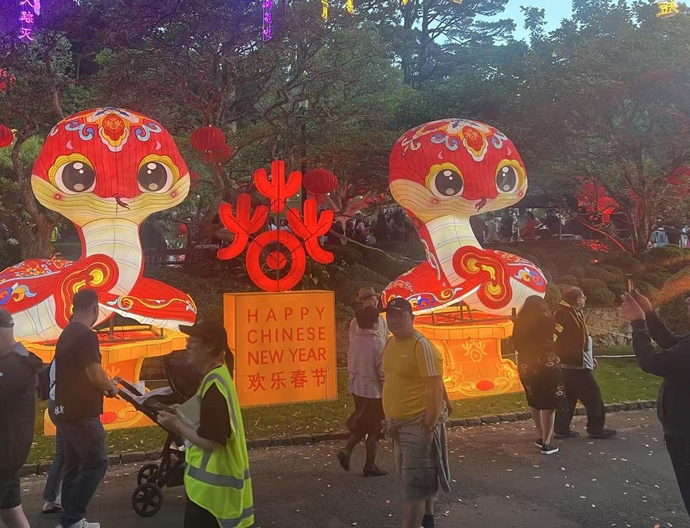 活动当天,惠灵顿阳光明媚,植物园内游人如织。夜幕降临后,星光璀璨,微风轻拂。园内张灯结彩,洋溢着节日的喜庆气氛。高达四米的“吉祥蛇”主灯栩栩如生,憨态可掬,吸引了众多市民前来拍照留念。主舞台连续两天上演了丰富多彩的中华文化节目,包括歌曲、舞蹈、器乐和戏曲等,精彩纷呈。舞龙翻腾出炽热中国心跳,圣公会热闹的文化摊位吸引了众多市民驻足体验,充分展示了中华文化的魅力,体现了多元文化的交融之美。此次活动不仅为当地民众带来了浓厚的节日氛围,也进一步促进了中新两国之间的文化交流与理解。