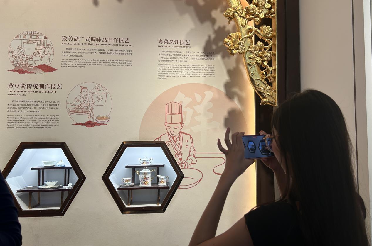 在“粤韵流芳” 展区,粤剧戏服的华美、广东音乐的雅韵让人驻足流连;“食在广州”板块的广式月饼、沙河粉等美食非遗,通过岭南工笔画般的场景呈现,勾起味蕾向往;“岁时节庆”里舞火龙、扒龙舟的民俗轴图,搭配互动屏让大家沉浸式感受广州人的“好意头”;“广作华彩”中广绣、玉雕、榄雕的精湛技艺,更让大家惊叹于岭南匠人的巧夺天工。