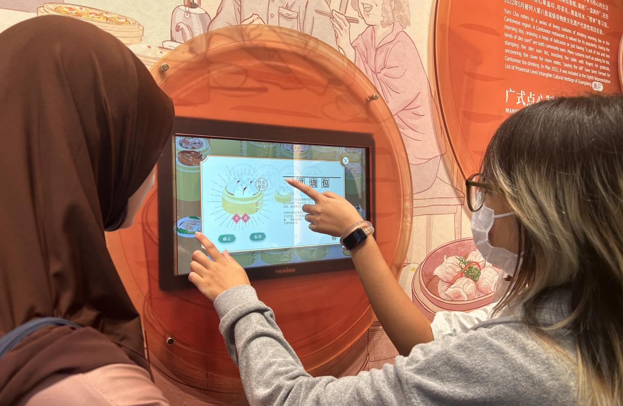 海珠湖畔的广州市文化馆,“十里红云一湾水,八桥画舫十六亭”的景致与非遗文化相映成趣。中心阁内,广州非物质文化遗产展的七大板块如同璀璨星河,铺展开广州非遗的全景画卷,来华留学生们逐一探寻“粤韵流芳”“食在广州”“岁时节庆”“医养岭南”“南拳强身”“广作华彩”“羊城古仔”的独特魅力。