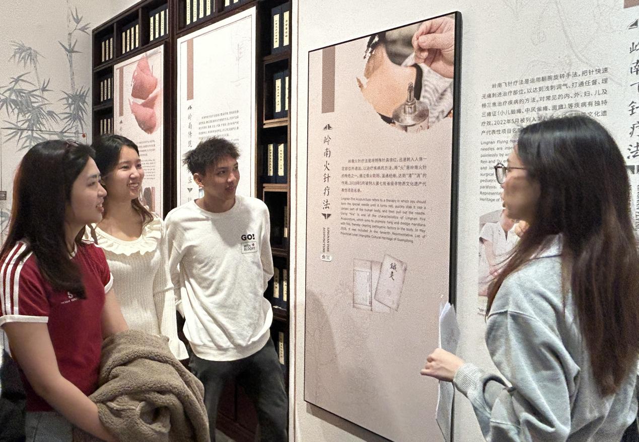 留学生们以小组为单位踊跃抢答,讨论声、欢呼声此起彼伏。有留学生精准答出 “广式月饼最经典的口味是伍仁和莲蓉”,赢得组员阵阵喝彩;还有留学生结合展区观察,顺利说出 “夏天中暑头晕时,广东人常用广藿香缓解”,展现了扎实的学习成果。获胜小组收获了印有粤绣纹样的非遗书签,非遗知识在互动中扎根心底。
