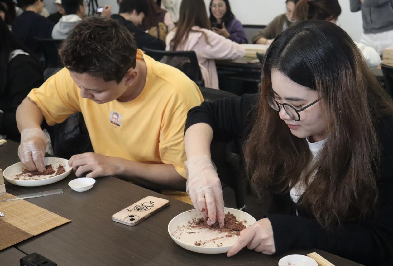 在翰墨园展厅,线香制作体验在草木清香中拉开帷幕。非遗导师徐倩君先带大家溯源香文化:从沉香“经外力淬炼方得香体”的独特成因,到檀香“老山新山各有风韵”的品鉴之道,让大家在鼻尖轻嗅间感受天然香料的沉檀温润。同时分享蝶香玫瑰、舒合香两款特色香方,让留学生读懂香与时节、健康的联结。
