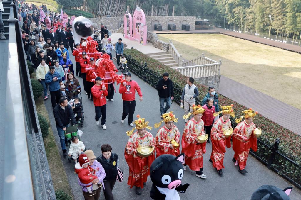当天上午,在熊猫猪猪园区大门前,随着鼓声渐响,“年猪大巡游”拉开序幕。队伍最前方是牧场的“形象大使”——憨态可掬的熊猫猪猪人形玩偶,腾跃翻飞的舞狮队紧随其后,象征着雄狮贺岁的吉祥寓意,在大家的簇拥下向园区舞台走去。