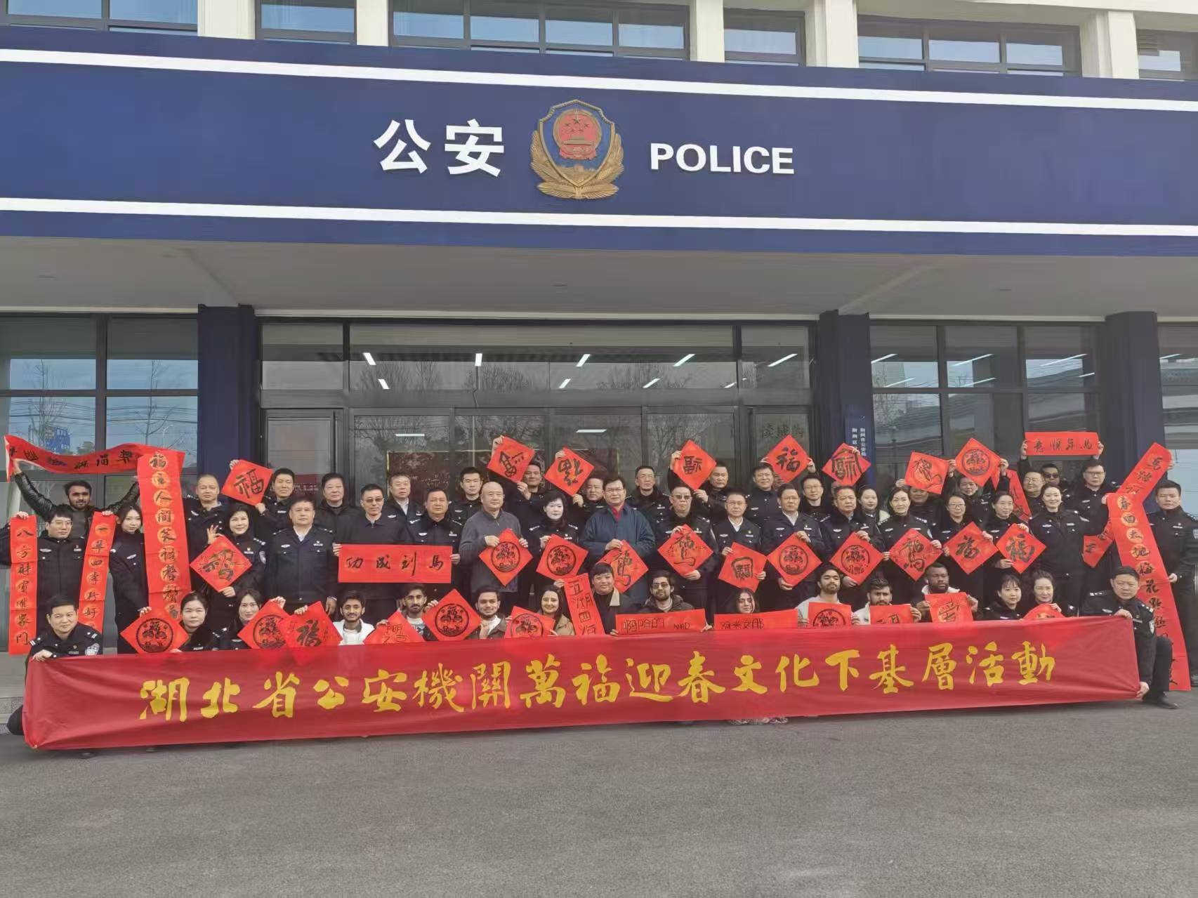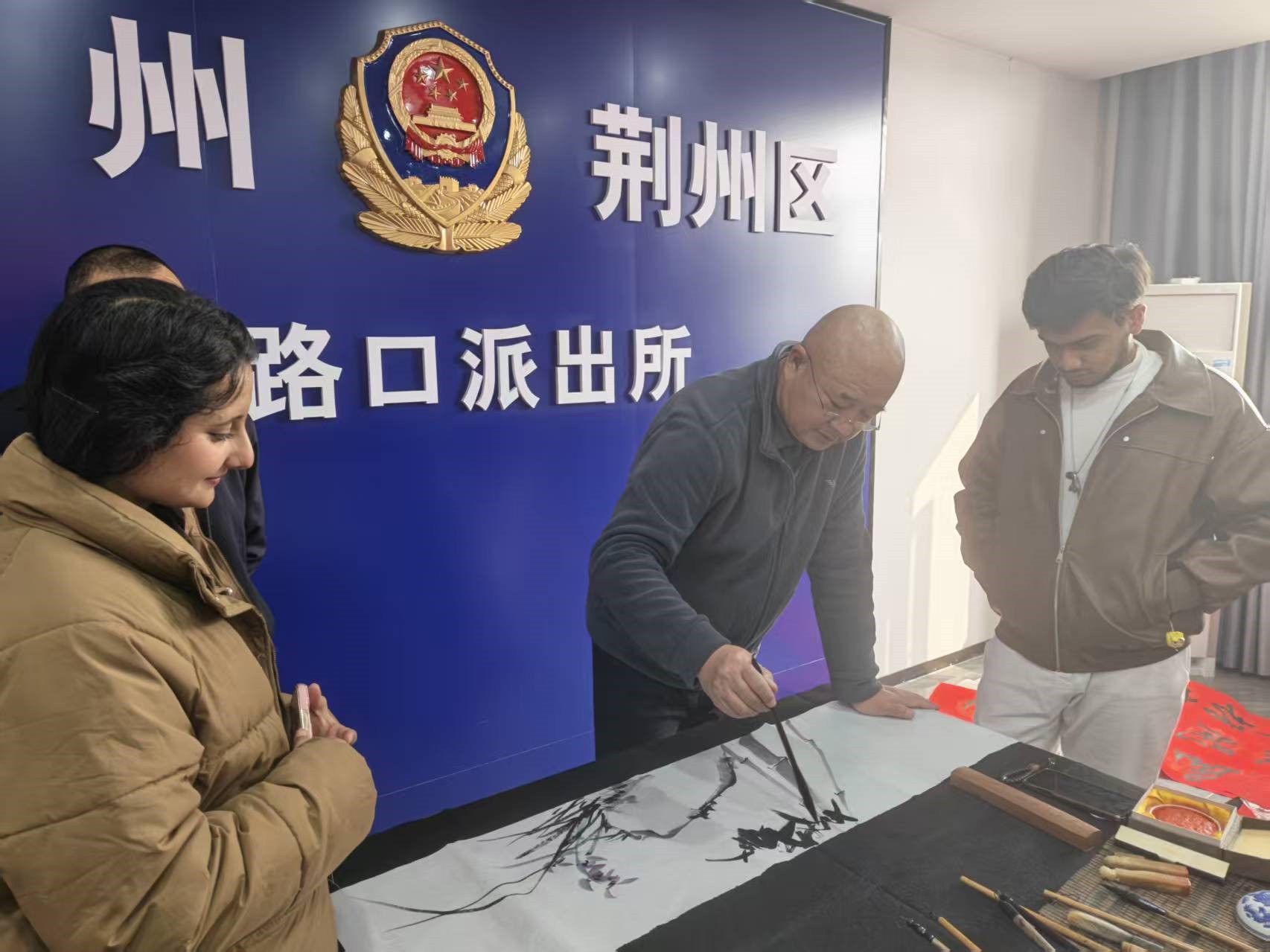 神州学人网讯 新春将近,为深入弘扬中华优秀传统文化,增进中外文化交流,1月28日,长江大学国际学院“丝路星光”国际学生志愿服务队受邀参加湖北省公安系统“万福迎春”文化下基层活动,与荆州区路口派出所的民警和荆州本地书法家们欢聚一堂,共写春联、品书画、迎佳节。