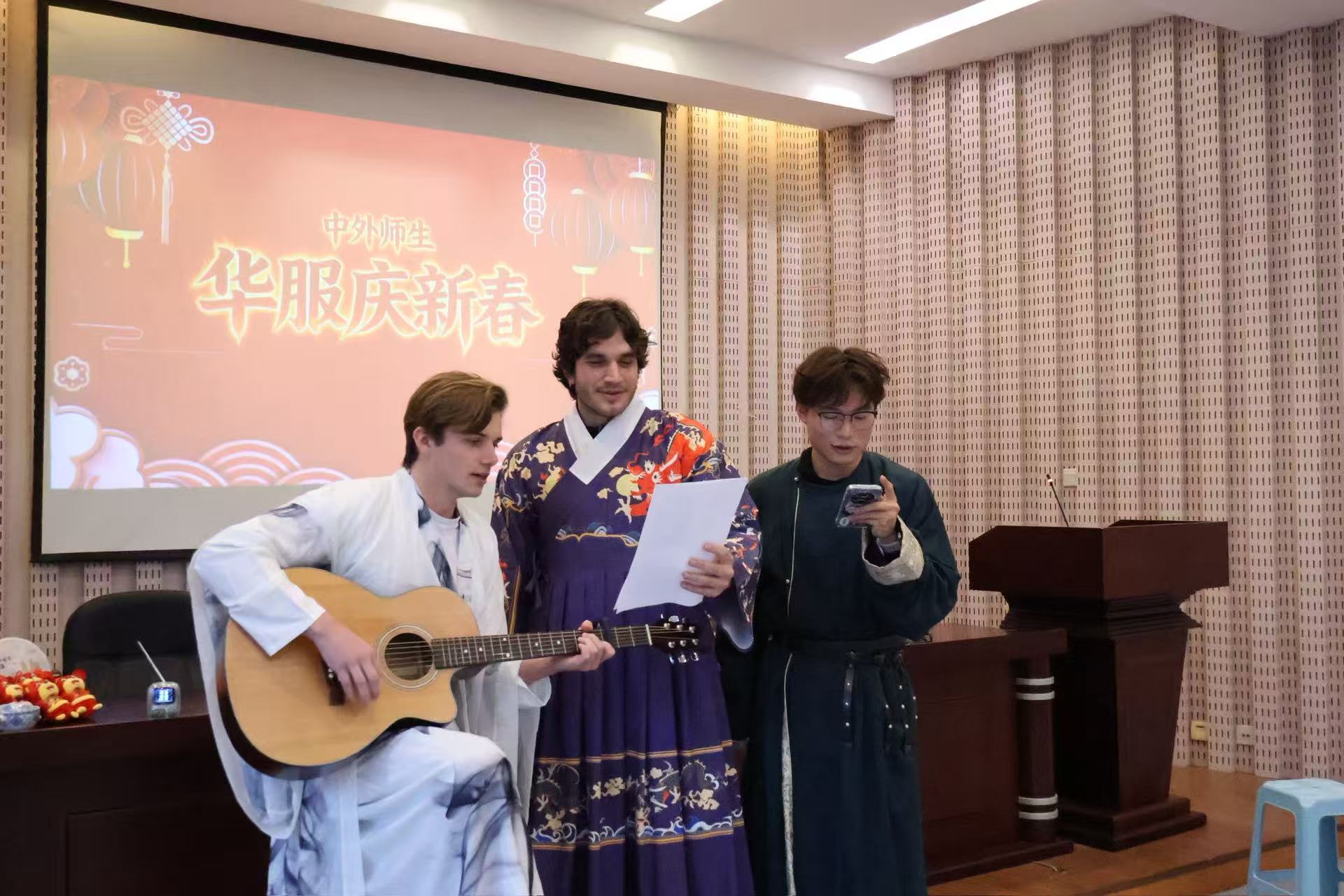 迎合着古琴余韵,留学生带来精彩的才艺表演。老挝留学生小米舞蹈柔美翩跹;巴西留学生萧俊安和李龙与中国学生怀抱吉他弹唱起现代歌谣;越南留学生用古筝拨出东西交融的旋律……