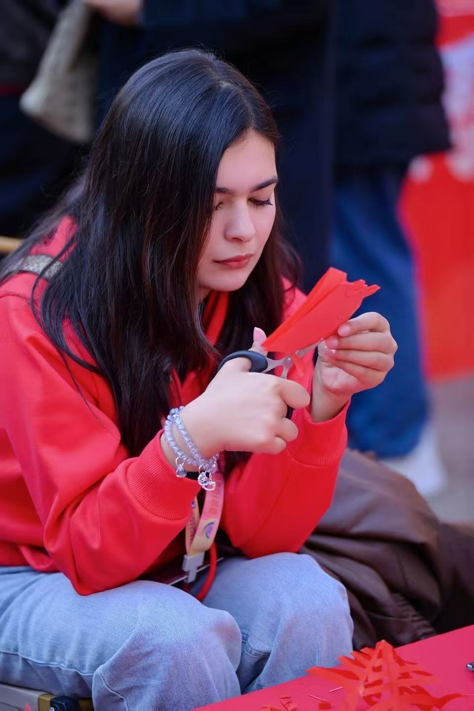 走到剪纸工作台前,手工艺人剪刀下的红纸如同精密的手术切口,每一折都透着东方美学。若华不禁感叹,东方手艺人与外科医生共享着“心手合一”的精神内核。在手工艺人的指导下,若华尝试剪出“春”字和窗花,第一次尝试的作品略显稚拙,但剪纸老师亲切地鼓励道,比起完美的作品,作品承载的祝福更加珍重。
