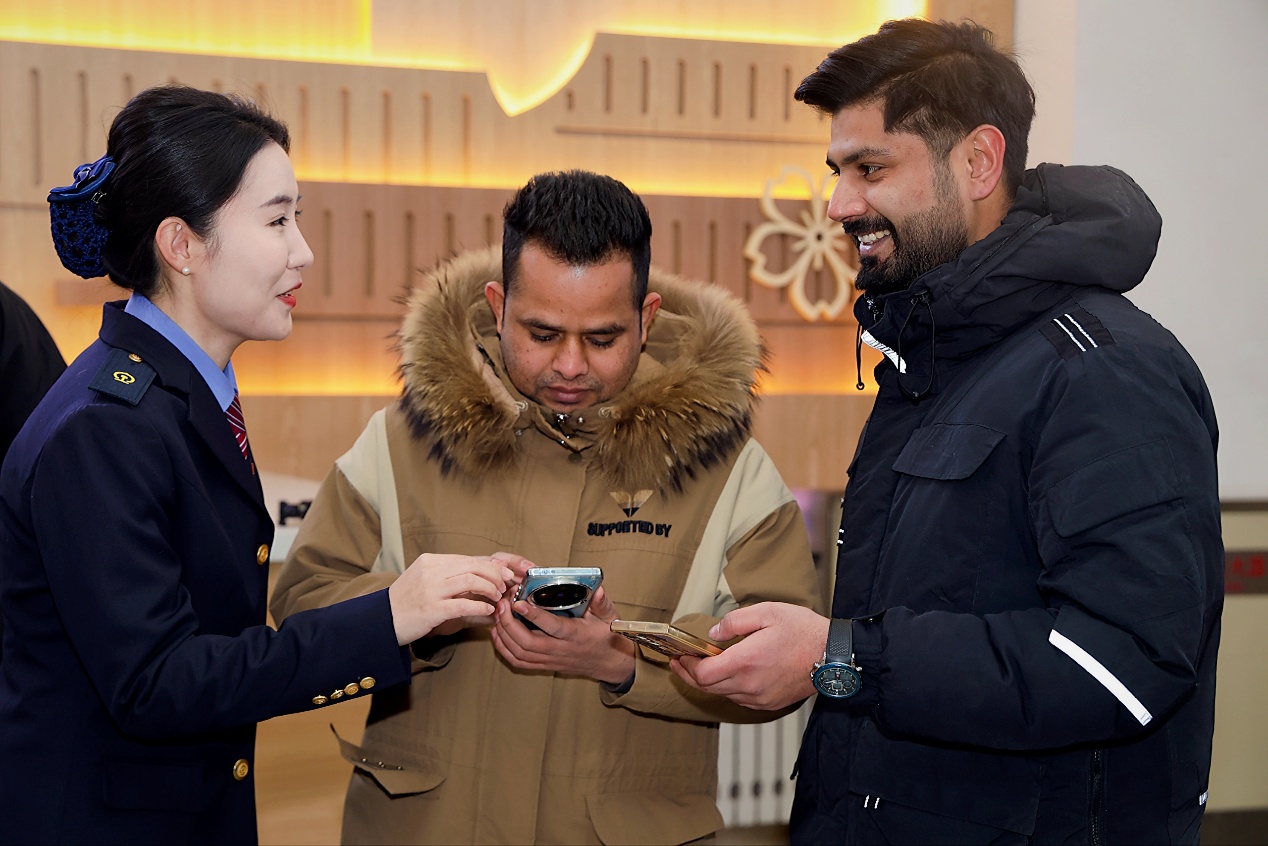 工作人员带领来华留学生体验购票、乘车等环节,展示中国高铁站如何提供高效智能的服务,并向同学们讲解了中国高铁发展历程和春运背后承载的“团圆”文化内涵。