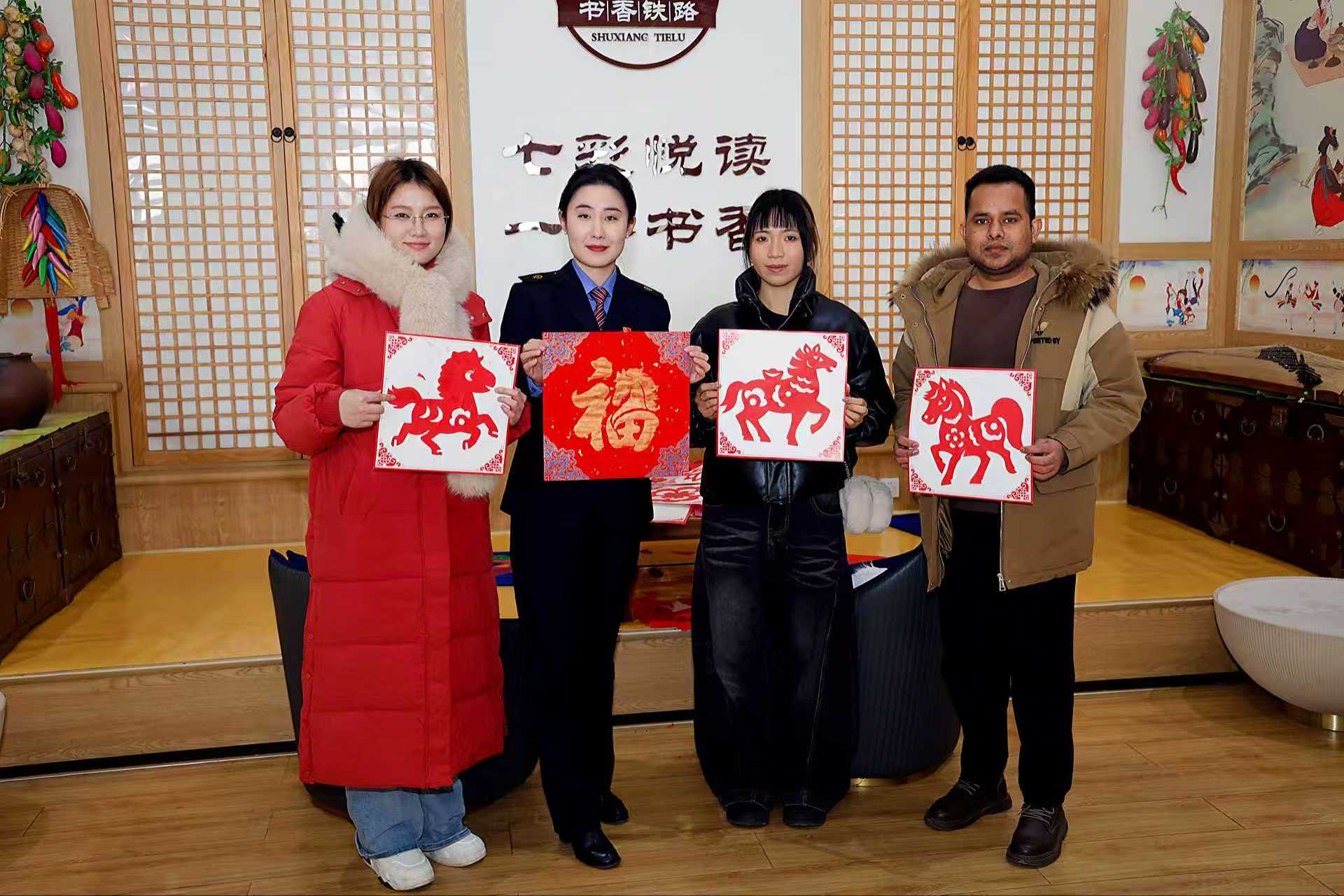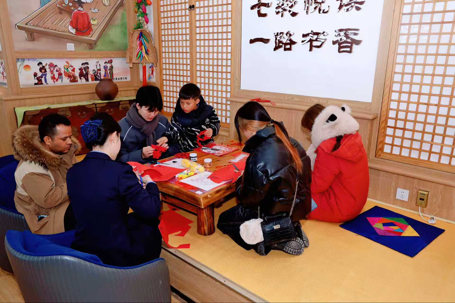 随后,工作人员带领同学们体验了站内特色的“最美高铁主题印章打卡”和非遗文化体验活动。大家亲手书写“福”字,制作窗花剪纸,更真切地理解春节蕴含的祈福寓意。