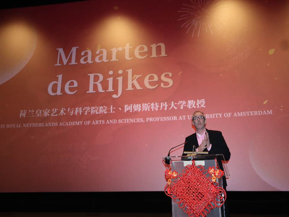 中国驻荷兰大使申博,驻荷使馆负责教育事务的参赞王文华,荷兰皇家艺术与科学院院士、乌特勒支大学教授、兰州大学特聘教授安德里斯·梅耶林克,荷兰皇家艺术与科学院院士、阿姆斯特丹大学教授马尔滕·德·赖克,荷兰伊拉斯姆斯大学荣休教授、四川大学华西医院特聘教授海因·拉特,以及来自教育、科研、媒体和企业界的嘉宾应邀出席。荷兰瓦赫宁根大学校长卡罗琳·克鲁泽,中国工程院外籍院士、荷兰皇家艺术与科学院院士安东尼·比斯利,中国科学院院士、天津大学地球系统科学学院院长刘丛强通过视频送上新春祝福。