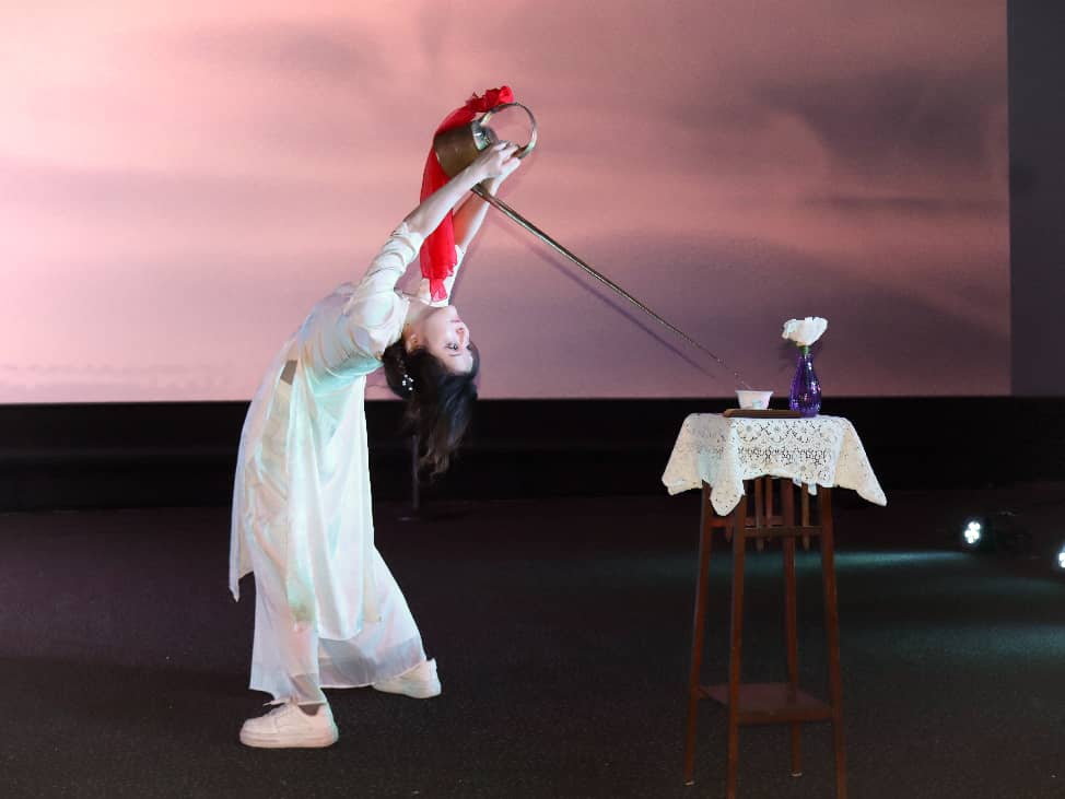 “承韵中华”篇章以中华优秀传统文化为精神内核,将汉服、戏曲与非遗技艺引入当代舞台,在历史与现实的交汇处展开一幅流动的文化长卷。舞台之上,典雅的服饰意象徐徐铺展,衣袂流转间勾勒出东方审美的含蓄与从容;京剧经典唱段唱腔婉转、情感深沉,在一板一眼中讲述忠孝情义与家国牵挂;长嘴壶茶艺表演刚柔相济,行云流水的动作既见匠心,也见力量。