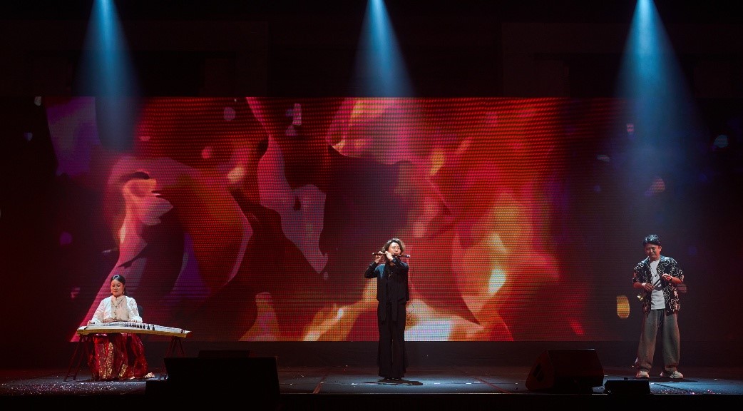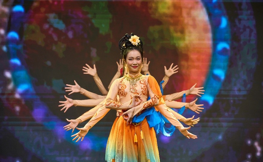 一首《策马奔腾》以骏马慷慨昂扬之势拉开第一篇章“华光初绽·丝路新韵织春色”的序幕,奏响青春的绚丽华章。悠扬旋律间,身着各民族特色服饰的表演者踏歌起舞,灵动舞姿勾勒出山河盛景,豪迈高亢的《爱我中华》声声传情。一曲《飞天绮梦》,舞者化身飞天壁画中灵气十足的仙子,带观众推开千年时光之门,领略敦煌浪漫。