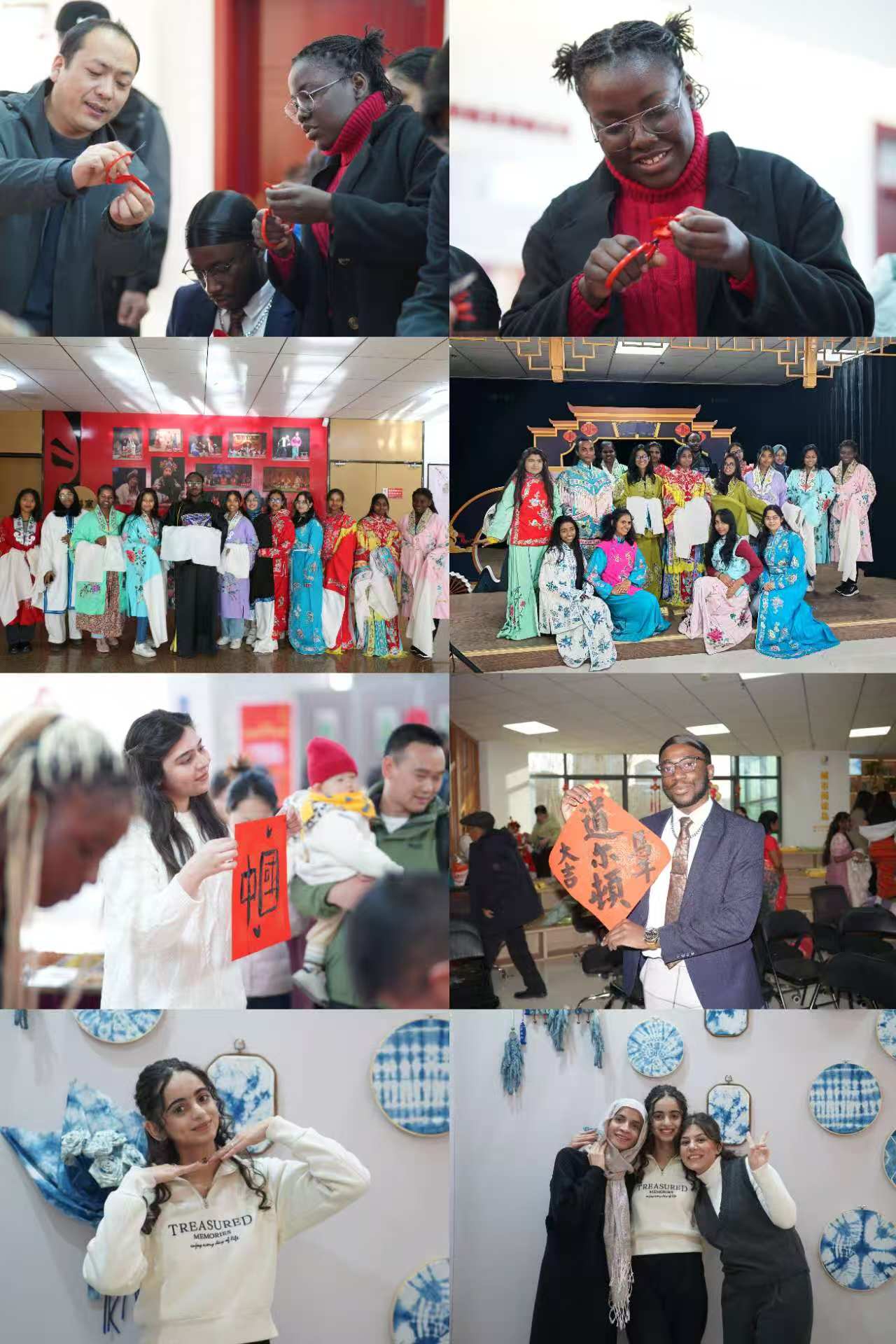 此外,学校还组织留学生走进银川市文化馆,开展沉浸式民俗体验活动。剪纸工坊里,刚果(金)留学生布米向非遗老师请教,亲手剪出“春”字窗花;戏服体验区,留学生试穿秦腔戏服,模仿抖袖、亮相,感受戏曲魅力;书法桌前,他们手握毛笔描摹“福”字与“中国”二字,在墨香中传递对中国文化的热爱。同时,大家还参与非遗知识问答、成语接龙等互动,体验糖画、八宝茶等特色项目,全方位感受春节民俗与文化内涵。
