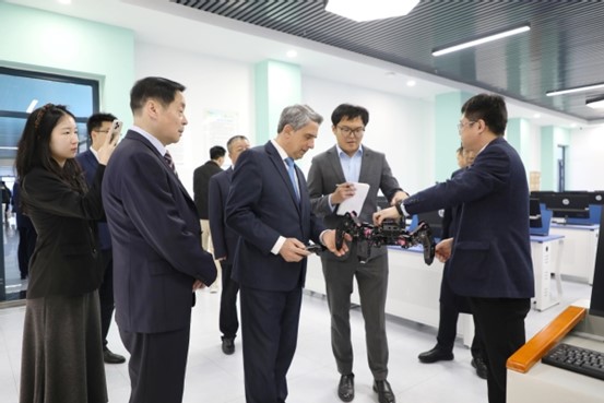 访问期间,罗森·普列夫内利耶夫一行参观了学校元宇宙研究院、低空经济研究院、智慧工坊等教育教学场所,详细了解学校在人才培养、产教融合、科技创新等方面的成果。