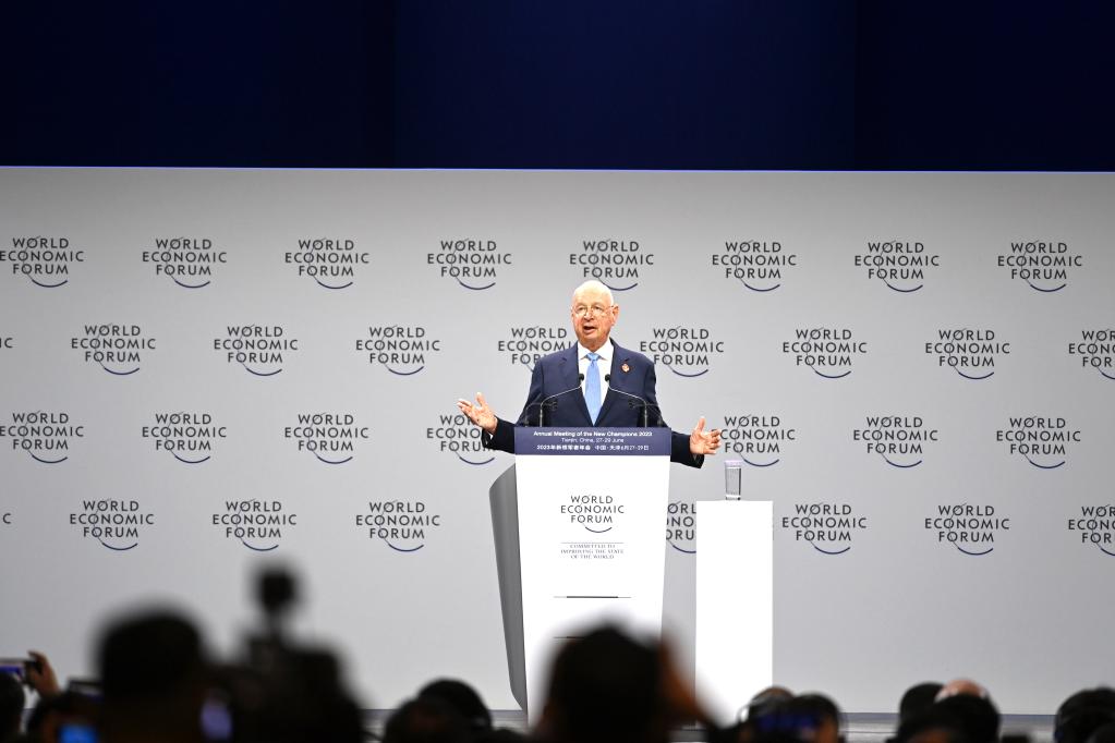 6月27日,世界经济论坛主席施瓦布在2023年新领军者年会开幕式上发言。