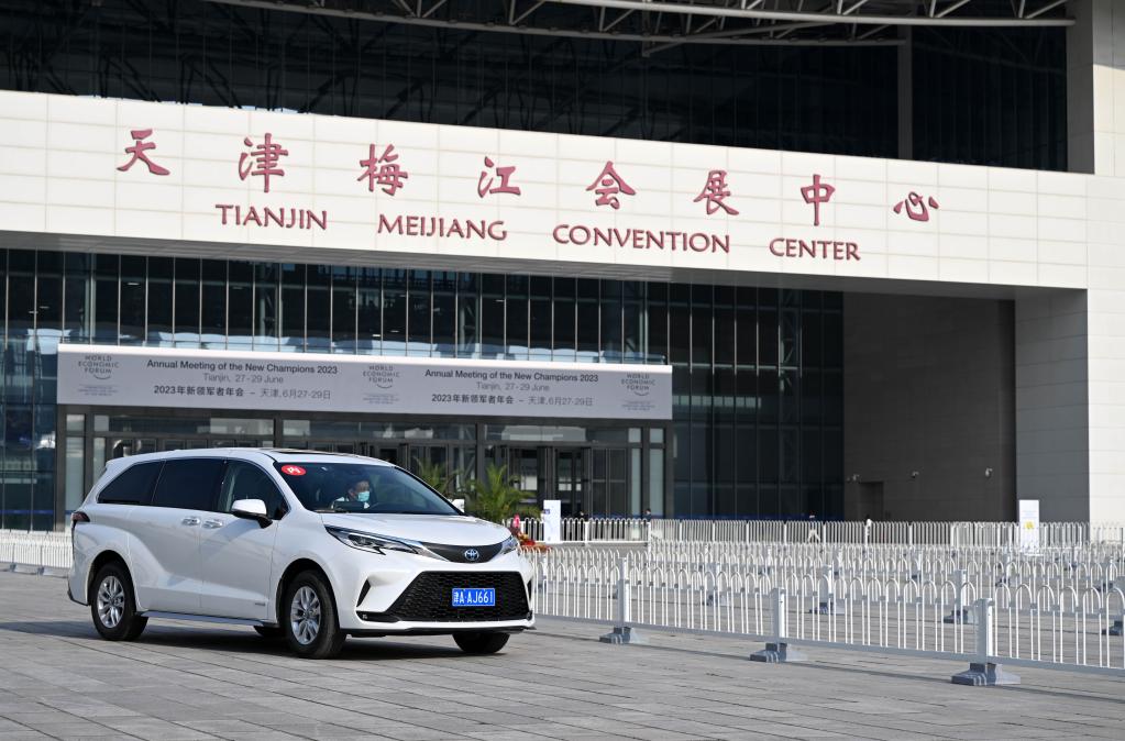 6月27日,一辆嘉宾用车从论坛会场前经过。