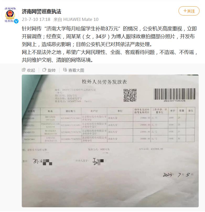 据山东省济南市公安局网络警察支队官方微博消息,针对网传“济南大学每月给留学生补助3万元”的情况,公安机关高度重视,立即开展调查;经查实,周某某(女,34岁)为博人眼球故意拍摄部分照片,并发布到网上,造成恶劣影响;目前公安机关已对其依法严肃处理。