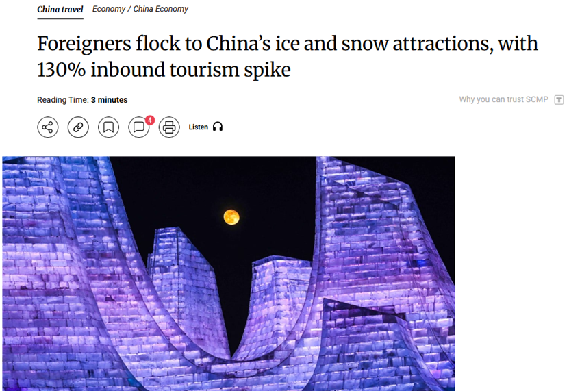 《南华早报》此前发文称,随着冬季天气转冷、签证政策放宽及东南亚强劲需求推动,从哈尔滨的冰雪城堡到新疆的滑雪场,再到四川的冰川,中国冰雪旅游目的地的入境游客人数大幅增长。根据在线旅行社携程网的数据,中国冬季旅游目的地的入境预订量今年同比增长近一成,部分地区的增长率超过130%。