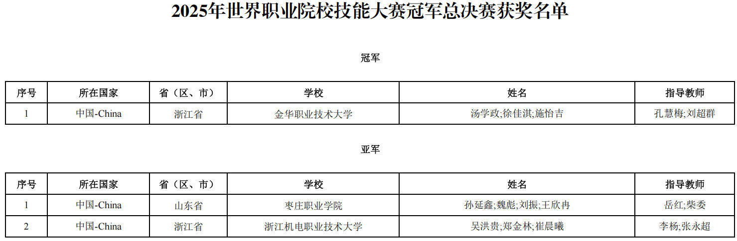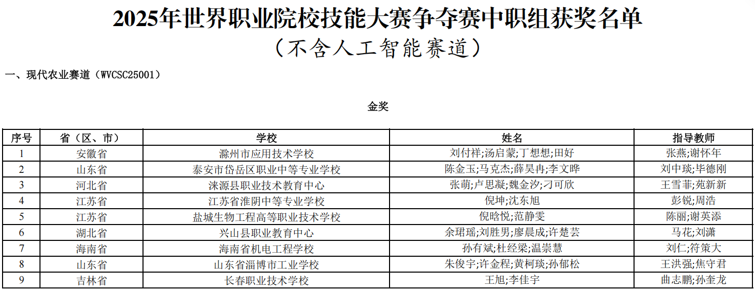 教育部日前公布了2025年世界职业院校技能大赛获奖名单。