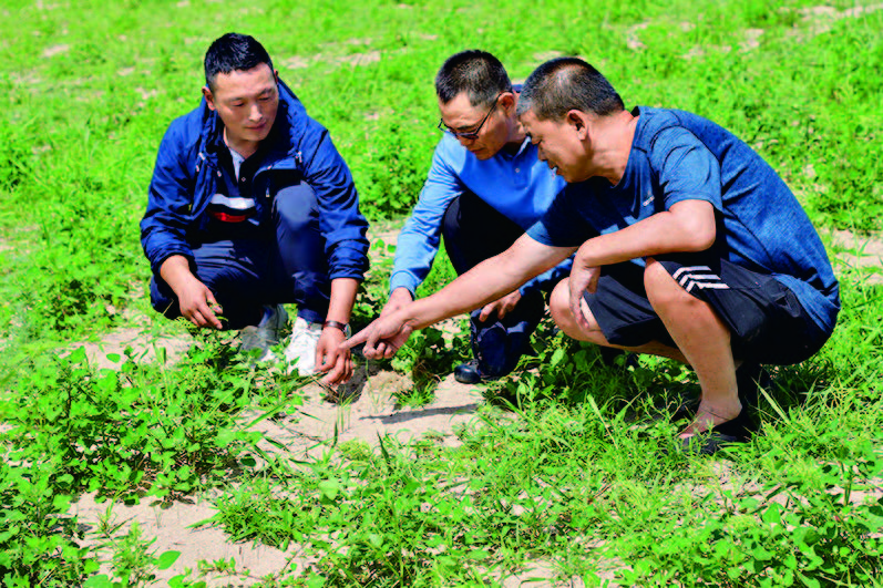 刘公社(中)刘辉(左)在通辽市开鲁县小街基镇的羊草种植地