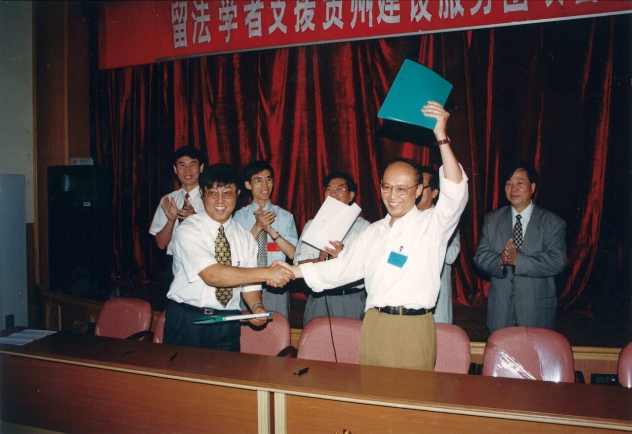 1999年8月30日,服务团用辛勤努力的工作迎来了这次支援贵州活动的高潮——合作协议的签字仪式。从上午10点开始,服务团驻地的多功能大厅气氛热烈,挤满了来自贵州省与服务团有合作项目的合作单位代表。首先,我代表服务团与贵州省代表共同签署双方的总体合作协议。随后,服务团成员分别与各自的合作单位负责人签署科教合作合同、协议书、意向书及备忘录共59份,服务团成员中有50人次被贵州省的大学、科研单位和工业企业聘为客座教授、客座研究员和学术委员会委员。