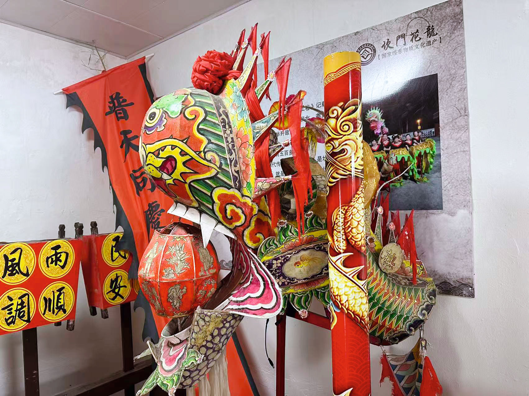 坎门花龙展示馆的花龙表演场景及展品