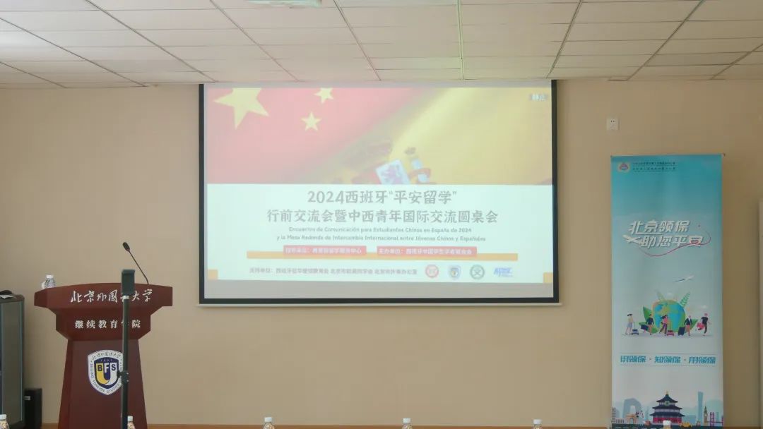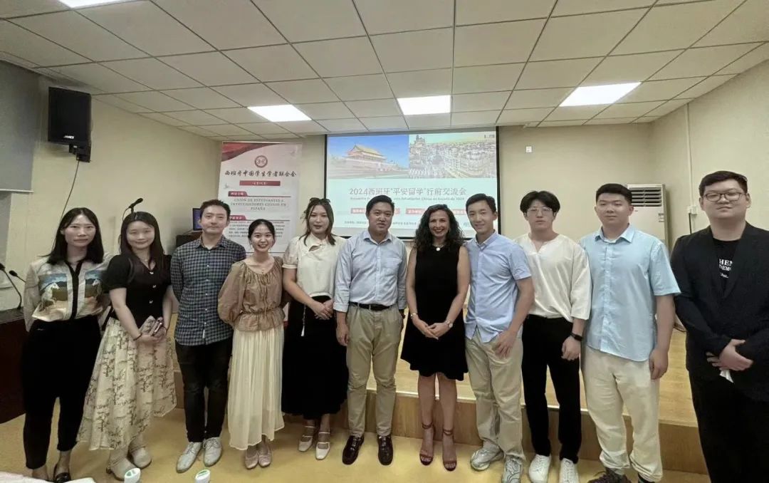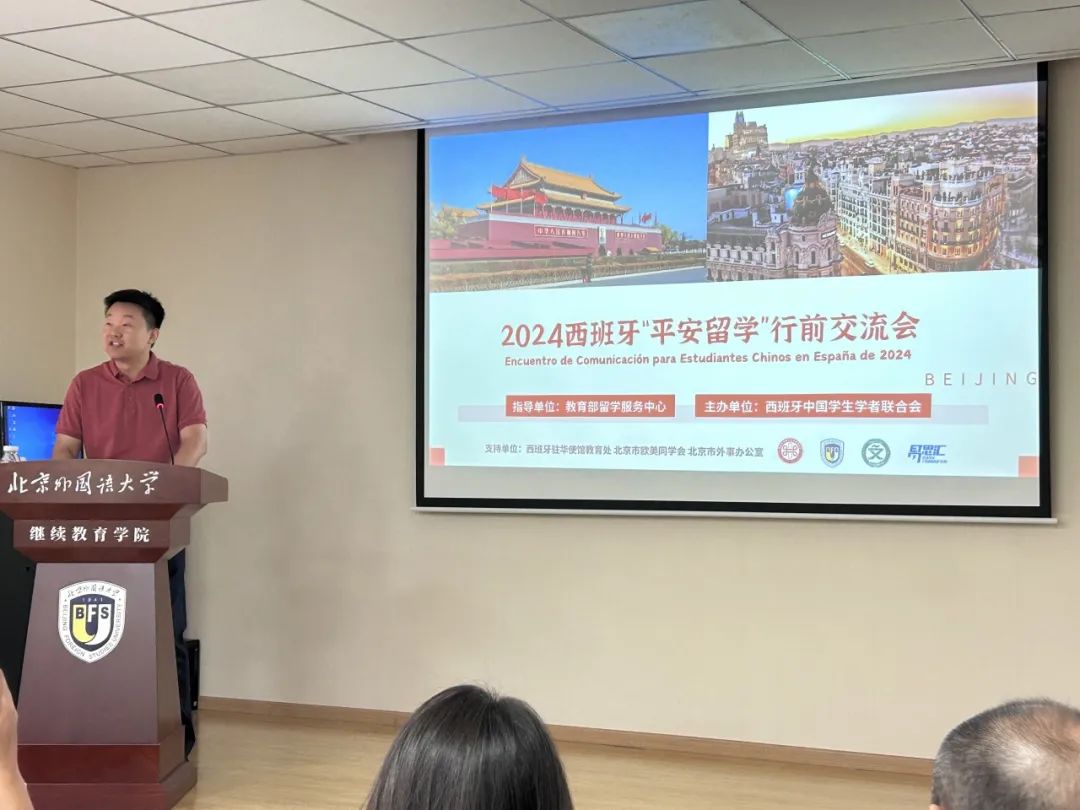 8月24日下午,由西班牙中国学生学者联合会(以下简称“全西学联”)主办的“平安留学”主题行前交流会暨中西青年国际交流圆桌会(以下简称“交流会”)在北京外国语大学继续教育学院举行。北京外国语大学继续教育学院、教育部留学服务中心、北京市外事办公室、北京市欧美同学会联络服务处、西班牙驻华使馆教育处相关负责人出席交流会,与即将留学西班牙的同学座谈,提供留学安全、学业规划、领事保护、心理健康等方面的专业指导。交流会同时采用在线直播方式,线上线下结合模式吸引6000余人参与。