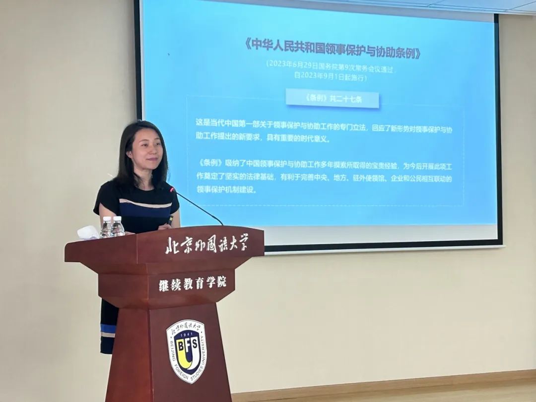 北京市外事办公室工作人员朱克诺重点介绍了领事保护的概念及重要性,并提醒同学们在海外要时刻保持安全意识。她鼓励同学们加入当地的中国学联组织,以便在遇到困难时能够及时获得帮助。