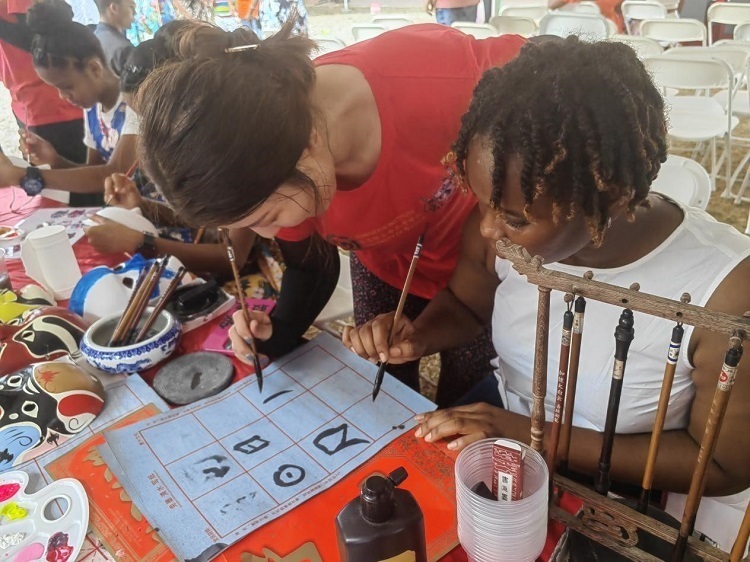 书法展示区,参与者尝试用毛笔书写。(圭亚那大学孔子学院供图)