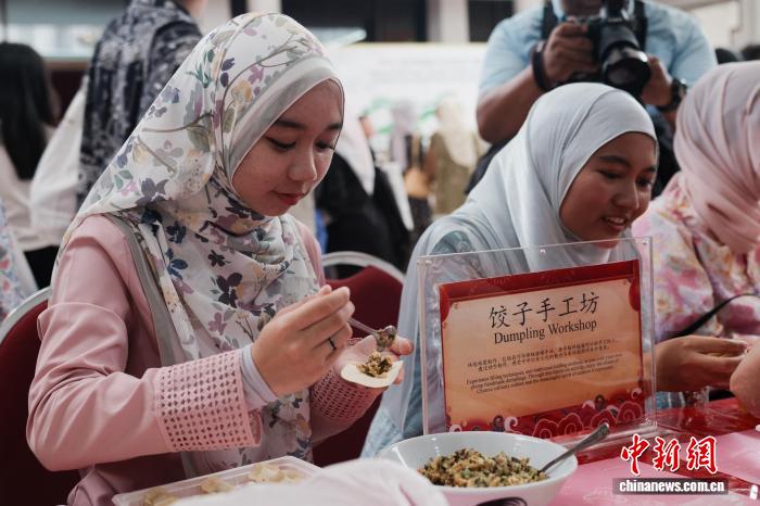 参与开放日活动的马来西亚大学生体验包水饺。 记者 陈悦 摄