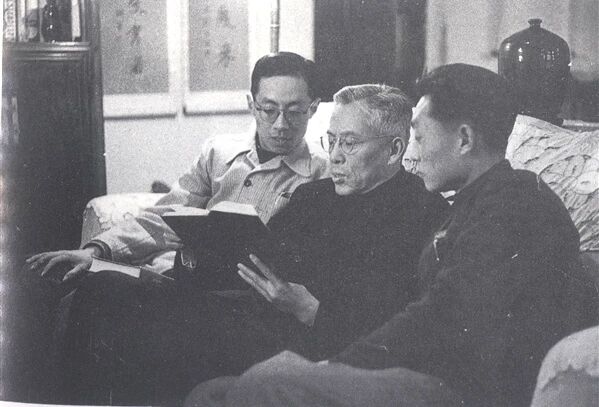 1963年底,周培源(中)在家中与学生黄永念(左)、李松年(右)讨论学术问题。来源/《周培源》(画册)