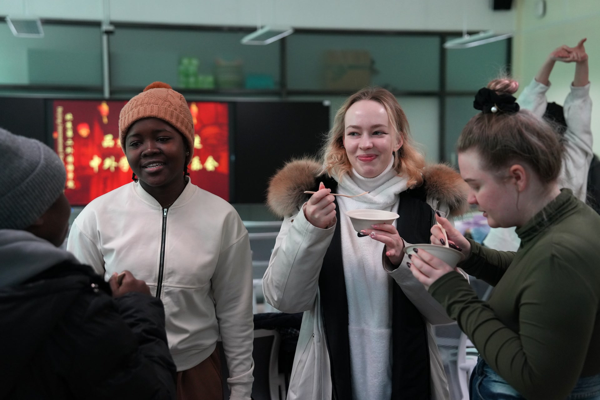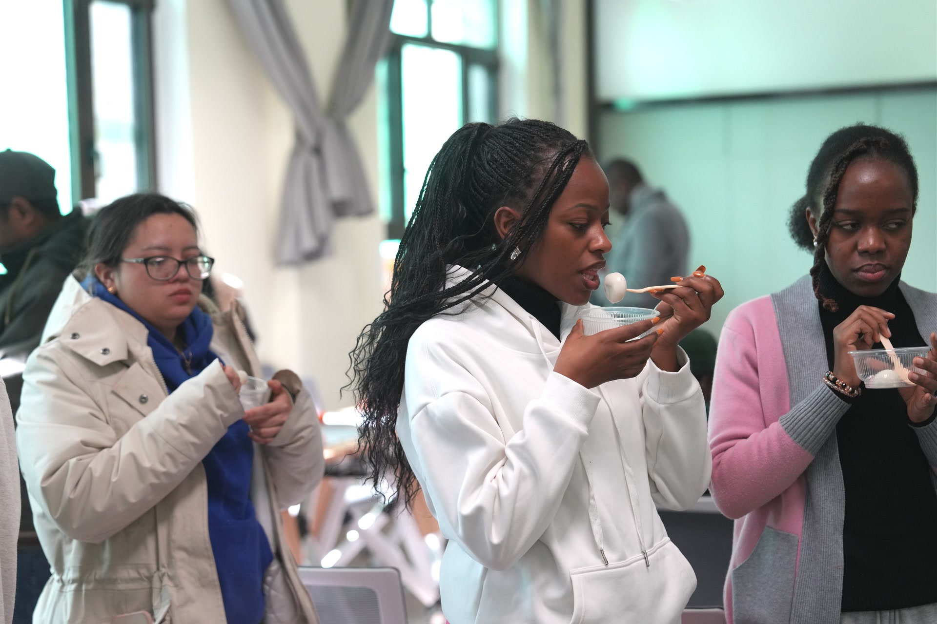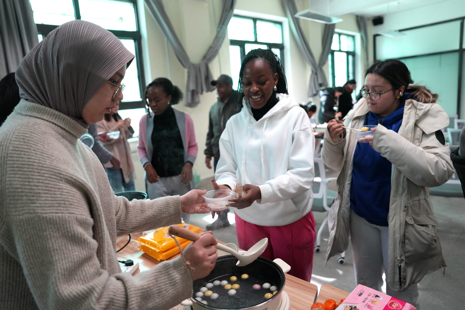 “热腾腾的元宵出锅了!”张衣笙将一碗碗冒着热气的元宵端上桌,热情地招呼学生们品尝。来自墨西哥的大一学生梅慧丽第一次吃元宵,便被香甜可口的黑芝麻馅“征服”了,“我喜欢在中国过节,因为可以吃到很多美食,大家团圆在一起,非常热闹。”