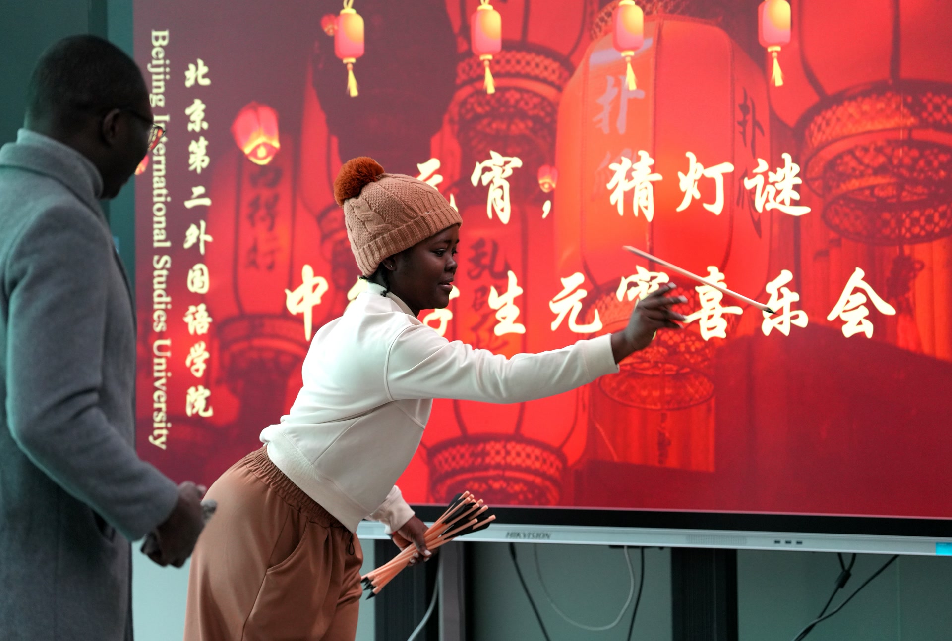 中国结、红灯笼、五颜六色的气球,北二外明德楼活动室里节日氛围浓。“大家快里面请,我们准备了很多零食,还有猜灯谜活动,猜中的人才能领元宵!”来自马里的外教老师张衣笙能说一口流利的中文,他边忙活着煮元宵,边招呼学生们积极参与活动。
