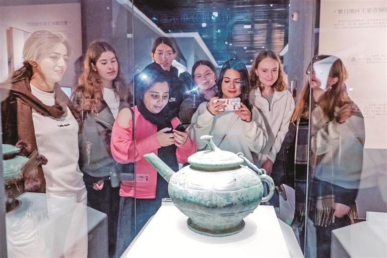 10月26日,安徽师范大学外国留学生应邀参访芜湖市繁昌区孙村镇中分村和繁昌博物馆。留学生们在繁昌博物馆里参观游览,在中分村金色的稻田里漫步,聆听稻田音乐会,沉浸式体验中国文化与乡村魅力。(特约摄影师 肖本祥 摄)