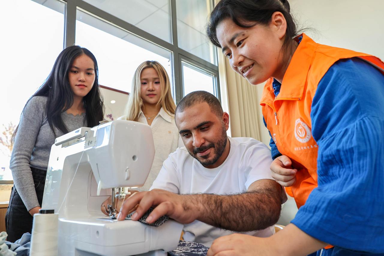 在布艺制作环节,留学生们围坐在村舍的工作台旁,手拿针线和布料,小心翼翼地缝制小物件。来自泰国的留学生林鑫妍(音译)选择了浅色的布料,专注地为自己缝制了一个发圈。她笑着说:“这是我第一次体验布艺,特别开心。这个发圈和我的头发很配。”大家还学习使用了老式缝纫机,“咔哒咔哒”的声音让留学生们兴奋不已。