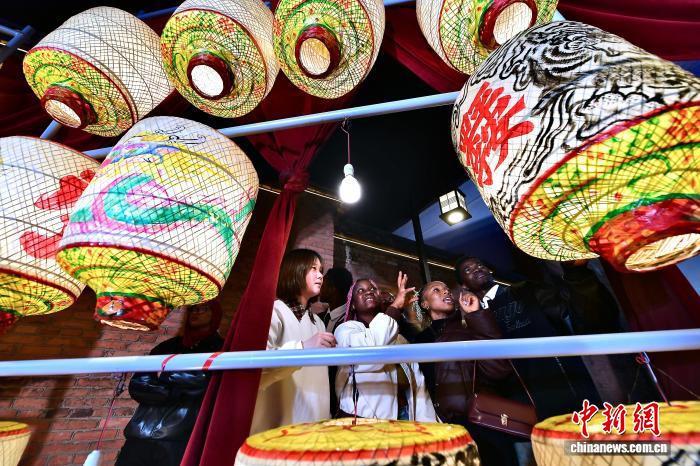 1月30日晚,留学生在历史文化街区了解高照灯制作技艺。中新社记者 张斌 摄