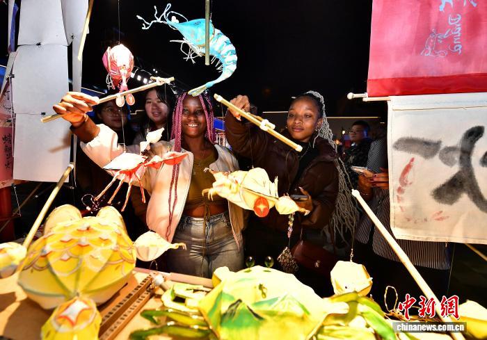 1月30日晚,留学生在历史文化街区了解展示的高照灯。当日,来自福州外语外贸学院的20多名留学生走进福州上下杭历史文化街区,参观市集上展示的高照灯、鱼灯、花灯和体验闽剧表演,零距离感受中国传统文化魅力。中新社记者 张斌 摄