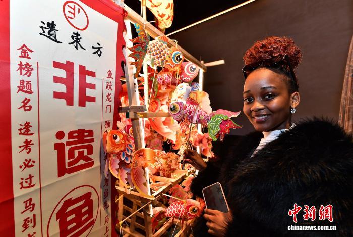 1月30日晚,留学生在历史文化街区了解展示的鱼灯。中新社记者 张斌 摄