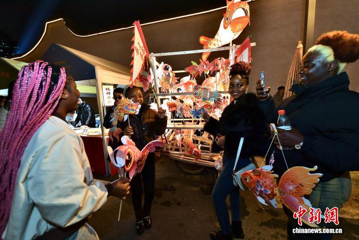 1月30日晚,在历史文化街区展示的鱼灯吸引留学生前来参观。中新社记者 张斌 摄