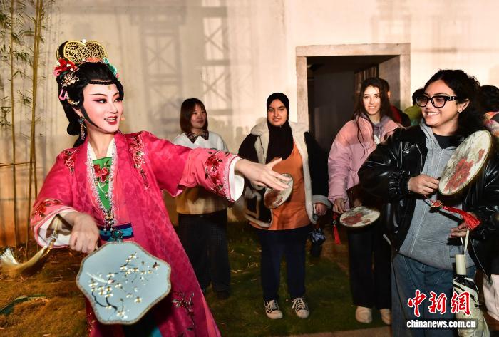 1月30日晚,留学生向在历史文化街区表演的闽剧演员学习戏曲动作。中新社记者 张斌 摄