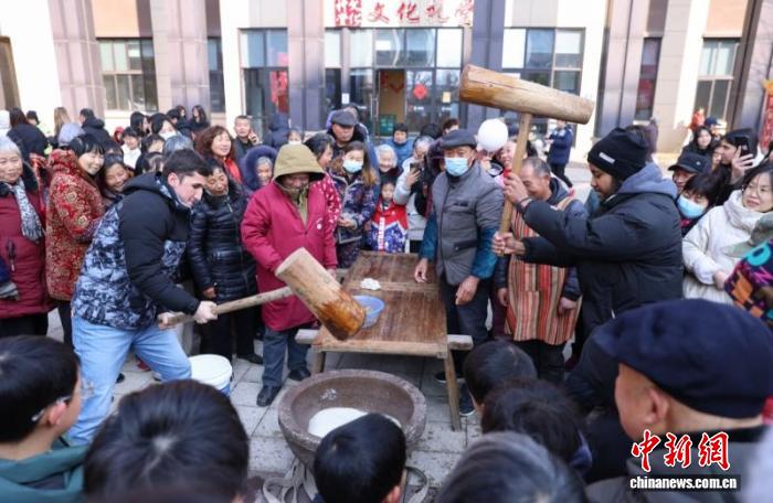 “洋学生”打年糕,体验新春年俗。赵宁 摄