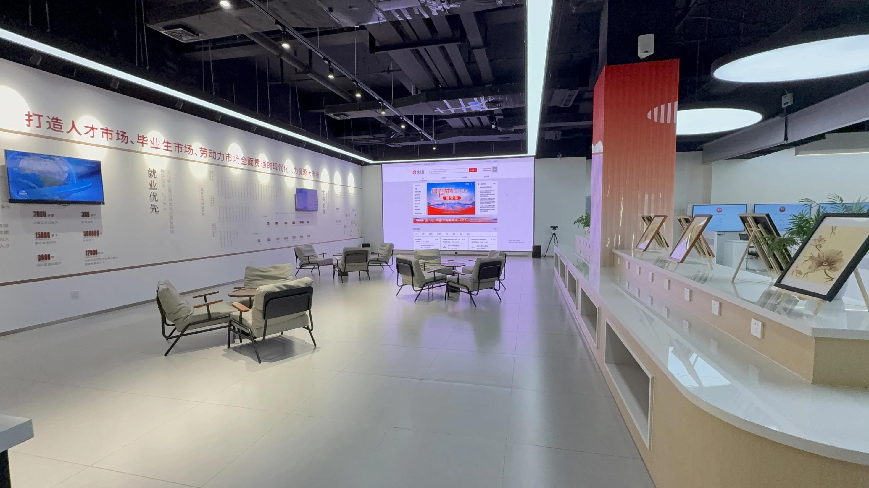 在人才集市共享空间活动区,开阔的场地配备专业级超清大屏,满足路演、发布、培训、沙龙等多种活动需求;在招聘区设有规范化招聘展位、带岗直播间,为企业提供高效、便捷的面对面人才对接服务。