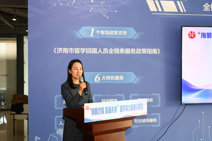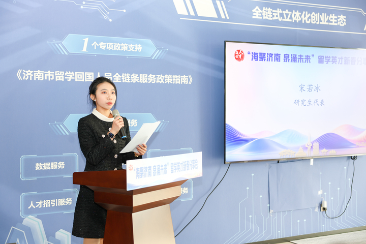 会上,现场播放了《我在济南刚刚好》2025济南城市人才宣传片及主题曲MV;为留学生青年人才作了人才和金融服务政策解读;留学服务企业代表侯双喆,优秀留学人才代表香港城市大学城市设计专业博士研究生贾政武、英国布里斯托大学数学专业硕士研究生宋若冰,分享了他们的逐梦故事;市委组织部副部长、市委人才办常务副主任王玉跃为青年人才代表颁发“济南市双招双引大使”聘书;留学生代表美国南加利福尼亚大学硕士研究生林泽宇宣读《“海聚济南 泉涌未来”致全市广大留学青年的倡议书》。
