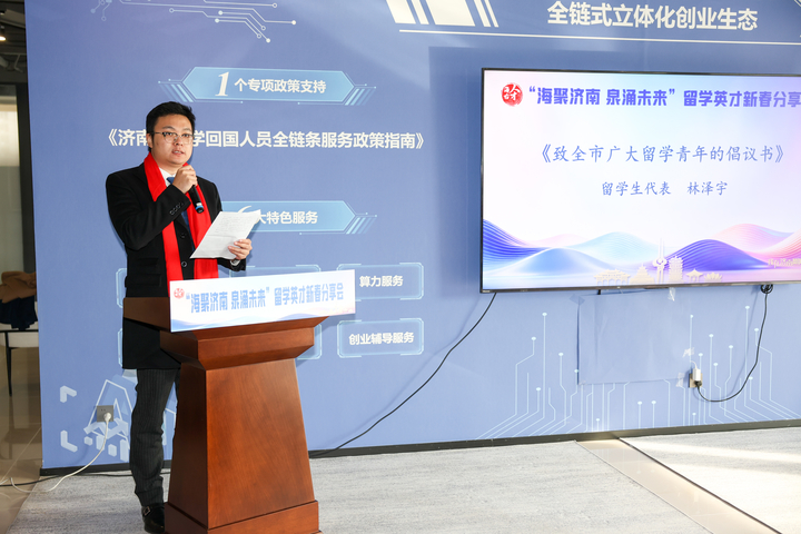 林泽宇宣读《“海聚济南 泉涌未来”致全市广大留学青年的倡议书》