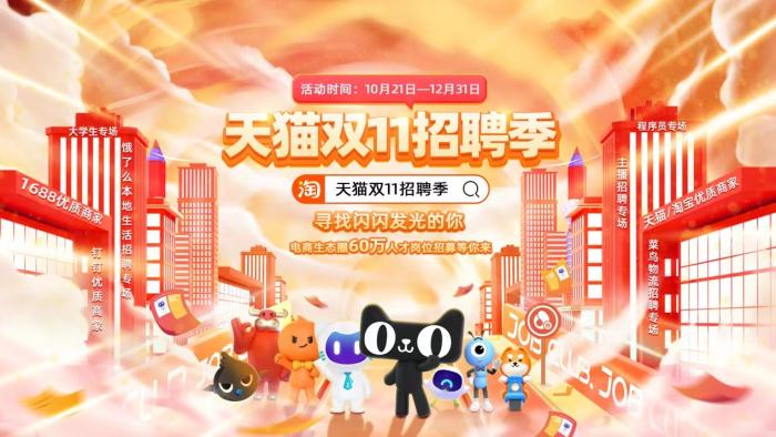 据悉,“天猫双11招聘季”活动将从10月21日开始,一直持续至12月31日。求职者可通过淘宝首页搜索“天猫双11招聘季”或“天猫双11找工作”,直达招聘活动会场页面,并投递简历。