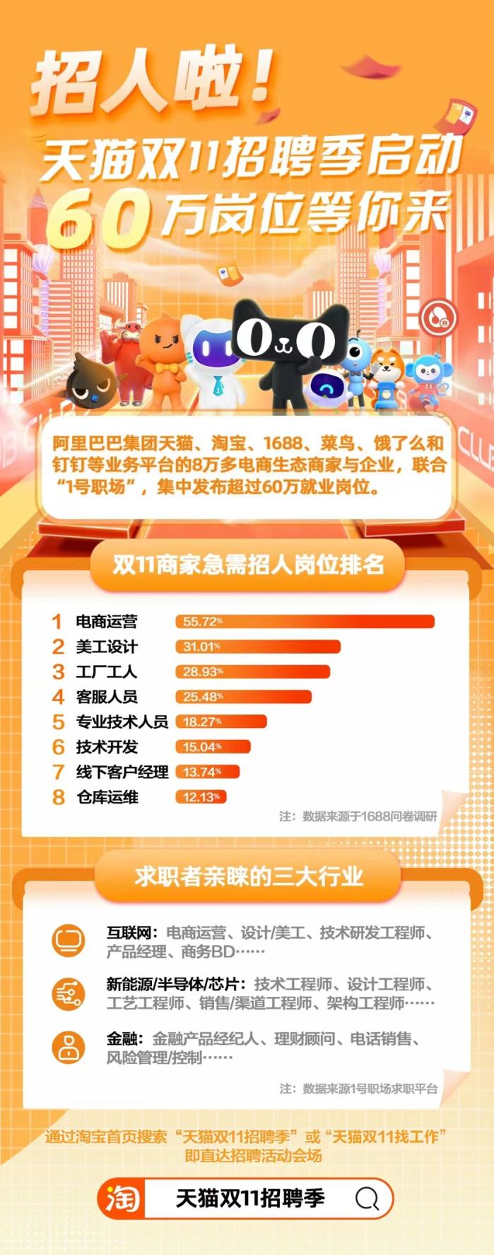 10月21日,“天猫双11招聘季”活动正式启动。阿里巴巴联合第三方招聘平台“1号职场”,发动天猫、淘宝、1688、菜鸟、饿了么和钉钉等业务平台上的8万多商家与企业,集中发布超过60万的电商岗位人才招募。
