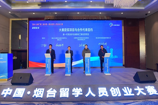 其中,一等奖获得者丁轶教授的“新一代高效多孔镍基化工催化剂”项目,主要针对雷尼镍安全性低以及镍利用效率低的问题,成功开发了新一代多孔镍催化剂,具有不自燃、性能高、镍利用率高、成本低的特点,可实现雷尼镍催化剂的替代,并与烟台力合国际先进技术创新中心有限公司、长春黄金研究院烟台贵金属材料研究所有限公司、烟台显华科技集团股份有限公司达成初步合作。此外,吴军兵的“锐刻生物”项目与山东博观成像生物科技有限公司、毛岩鹏的“微波智能装备”项目与烟台北方微波技术有限公司、孙涛的“一种可用于液氧贮存的耐超低温、抗氧化特种环氧复合材料”项目与烟台万沐新材料有限公司、刘俊男的“—超低温高能量密度锂离子电池”项目与烟台核电清洁能源研究院有限公司、汪春波的“—糖尿病及其并发症新型营养学干预技术研发及产业化应用”项目与烟台先创三维科技有限公司达成战略合作,并分别现场签订合作协议,充分展现出本次大赛获奖项目含金量和技术应用的巨大潜力。