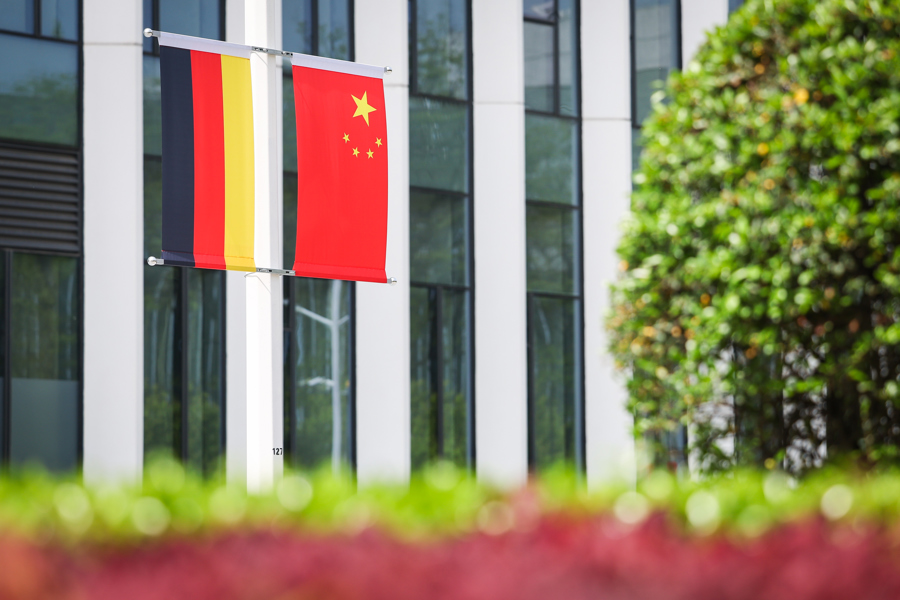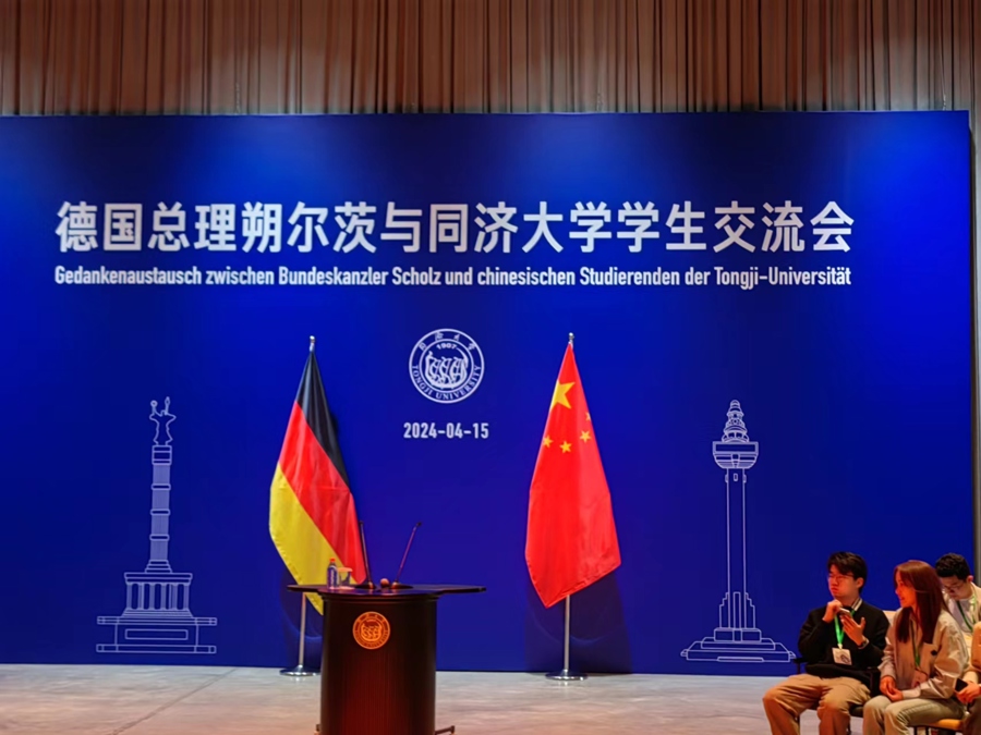 为迎接总理一行,同济大学嘉定校区艺嘉楼前悬挂中德两国国旗。一楼音乐厅中央,蓝色背板前放置中德两国国旗,背板上方印有双语“德国总理朔尔茨与同济大学学生交流会”,下方左右侧印有德国柏林胜利女神纪念柱与同济大学继往开来柱。