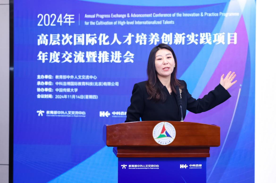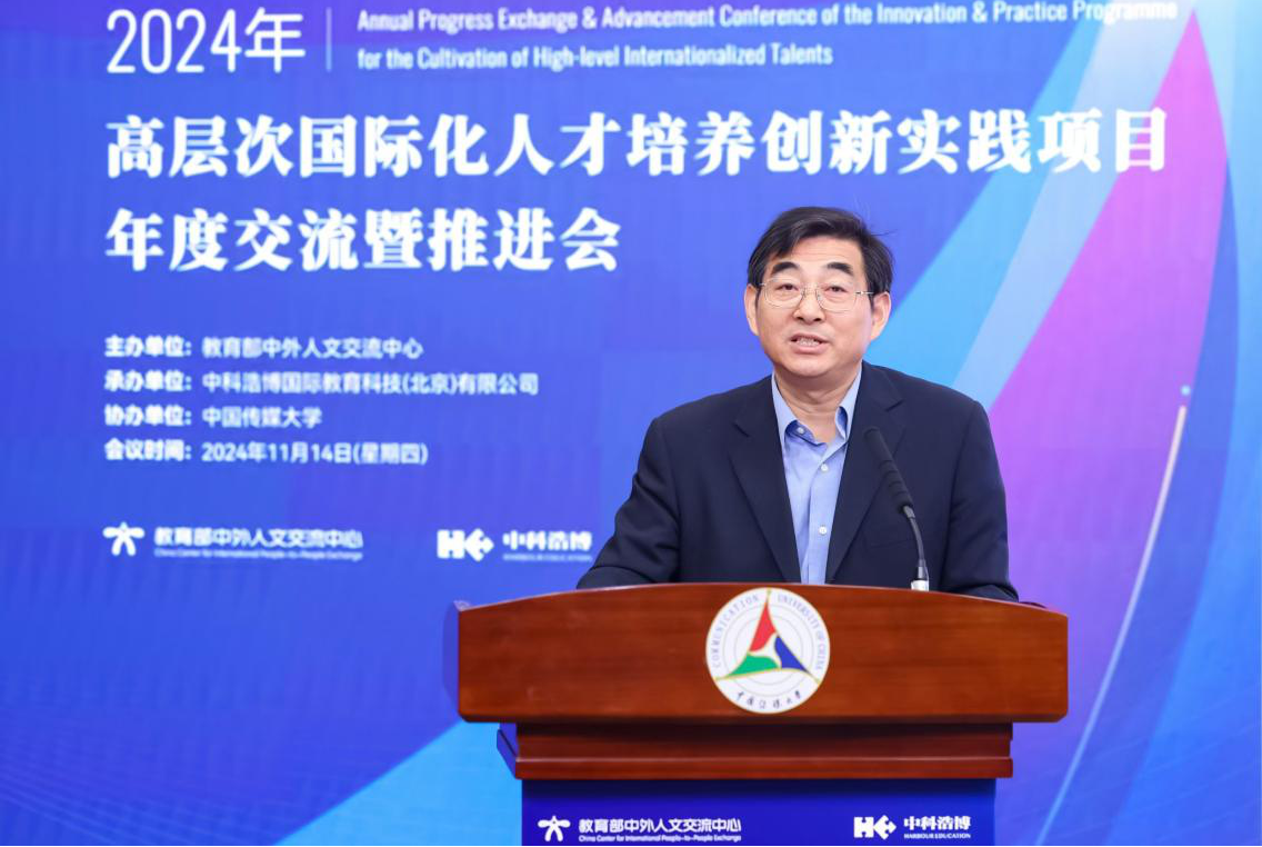 2024年11月14日,由教育部中外人文交流中心主办、中科浩博国际教育科技(北京)有限公司承办、中国传媒大学协办的“2024高层次国际化人才培养创新实践项目年度交流暨推进会”在中国传媒大学举办。教育部有关司局和单位领导、地方教育行政部门领导、高等院校和中学领导及项目负责人、相关领域专家、学者、从业人员,以及国际组织代表等众多嘉宾参加了会议。会议总结项目进展与成效,交流思想与经验,研究新形势下如何创新思路与举措,更加有效地推动项目服务高校和中小学构建国际化人才培养体系、深化国际交流合作、推进高质量国际化就业。
